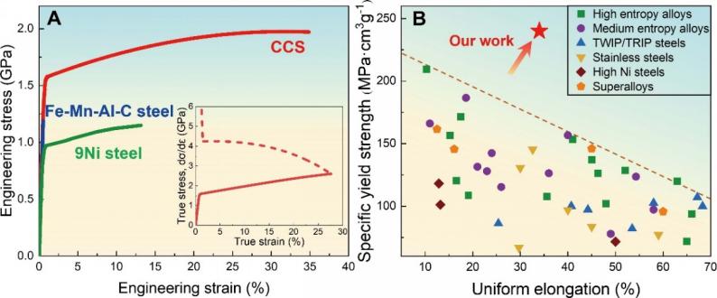 The engineering stress-strain curve under quasi-static uniaxial tensile test exhibitsan ultrahigh yield strength of 1586 MPa and an ultimate tensile strength of 1976 MPa, with a surprisingly high elongation of 34% at near liquid nitrogen temperature.Such remarkable mechanical performanceaddresses the low-temperature brittleness associated with traditional L’12κ-carbide coherent precipitation hardening approaches in austenitic Fe-Mn-Al-C lightweight steels. Thus, combining the benefits of super-highspecific strength and the cost-effective composition, the CCS emerges as a promising alternative for structural materials that can serve in the transportation and storage of liquid gas energy carriers.
