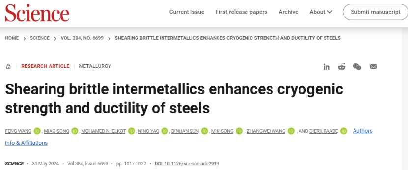 Recently, Prof. Zhangwei Wang and Prof. Min Song from the State Key Laboratory of Powder Metallurgy at Central South University published a research paper titled "Shearing Brittle Intermetallics Enhances Cryogenic Strength and Ductility of Steels" in the international academic journal Science. Dr. Feng Wang and Prof. Miao Song from the Powder Metallurgy Research Institute are co-first authors of the paper, while Prof. Zhangwei Wang, Prof. Min Song, and Prof. Dierk Raabe from the Max Planck Institute for Sustainable Materials in Germany are co-corresponding authors. The first affiliation of this paper is the State Key Laboratory of Powder Metallurgy, Central South University. Prof. Zhangwei Wang initiated the project and designed the concepts for the paper. The entire project was jointly led and completed by Prof. Zhangwei Wang, Prof. Min Song, and Prof. Dierk Raabe.