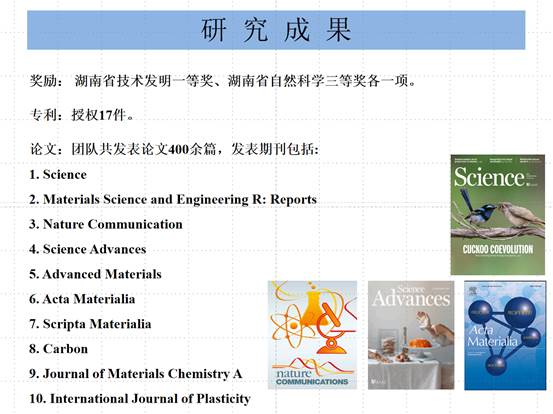 Rewards: First Prize for Technological Invention in Hunan Province, Third Prize for Natural Science in Hunan Province