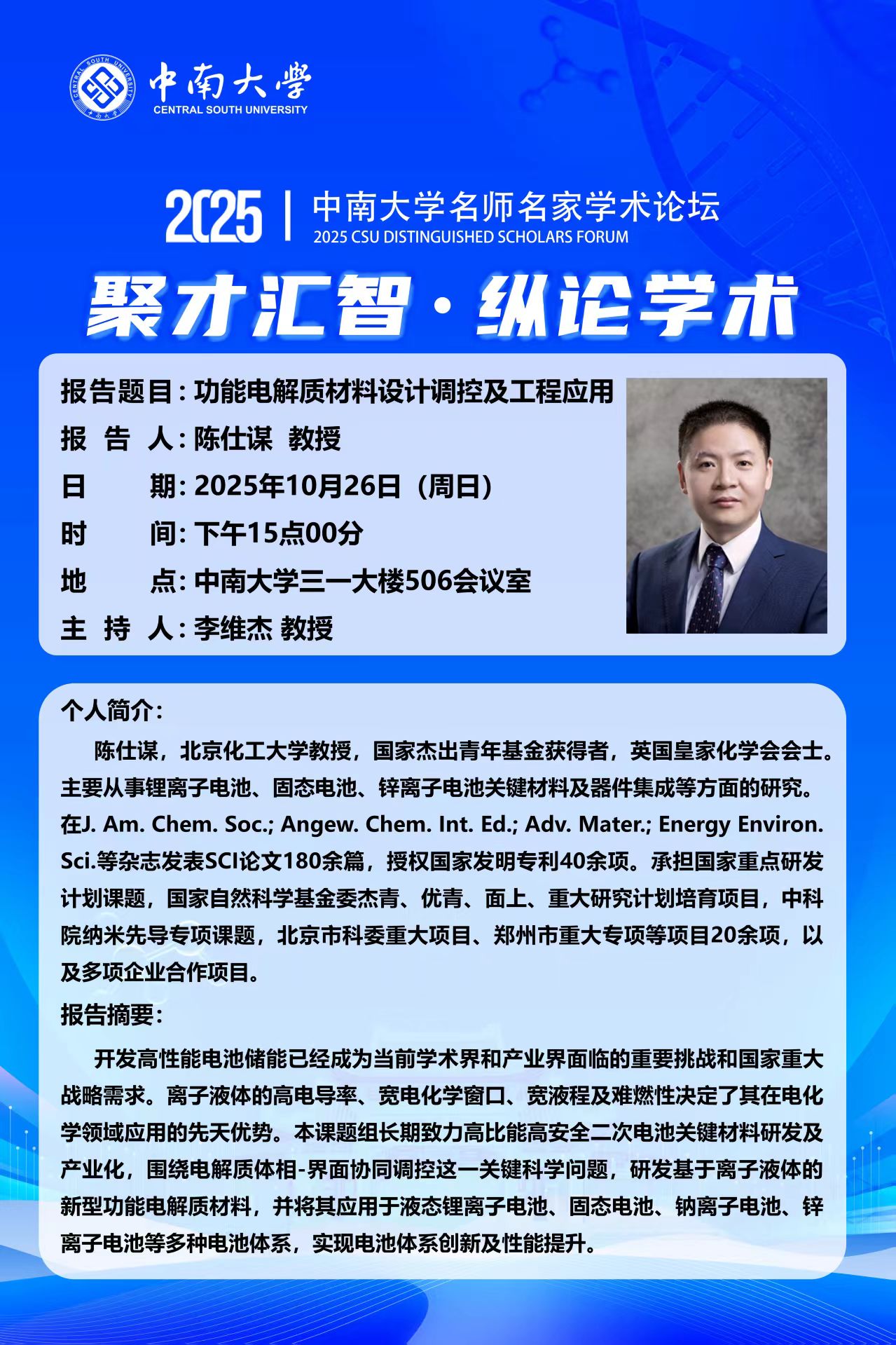 陈仕谋,北京化工大学教授,国家杰出青年基金获得者,英国皇家化学会会士主要从事锂离子电池、固态电池、锌离子电池关键材料及器件集成等方面的研究。在).Am.Chem.Soc.; Angew. Chem.Int. Ed.; Adv. Mater; Energy EnvironSci.等杂志发表SCI论文180余篇,授权国家发明专利40余项。承担国家重点研发计划课题,国家自然科学基金委杰青、优青、面上、重大研究计划培育项目,中科院纳米先导专项课题,北京市科委重大项目、郑州市重大专项等项目20余项,以及多项企业合作项目。