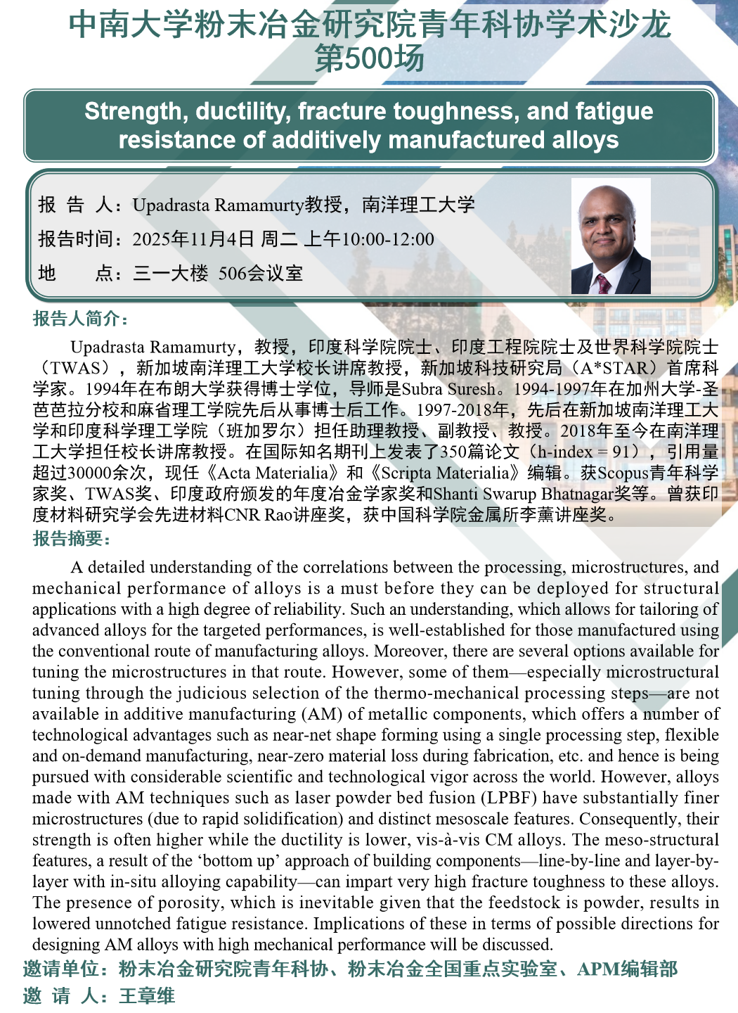 青年科协沙龙(第500场):Strength, ductility, fracture toughness, and fatigueresistance of additively manufactured alloys