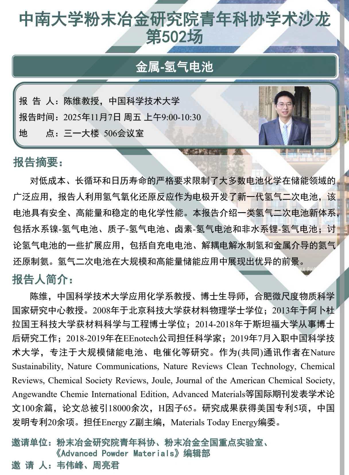 陈维,中国科学技术大学应用化学系教授、博士生导师,合肥微尺度物质科学国家研究中心教授。2008年于北京科技大学获材料物理学士学位;2013年于阿卜杜拉国王科技大学获材料科学与工程博士学位;2014-2018年于斯坦福大学从事博士后研究工作;2018-2019年在EEnotech公司担任科学家;2019年7月入职中国科学技术大学,专注于大规模储能电池、电催化等研究。作为(共同)通讯作者在NatureSustainability, Nature Communications, Nature Reviews Clean Technology, ChemicaReviews, Chemical Society Reviews, Joule, Journal of the American Chemical SocietyAngewandte Chemie International Edition, Advanced Materials等国际期刊发表学术论文100余篇,论文总被引18000余次,H因子65。研究成果获得美国专利5项,中国发明专利20余项。担任EnergyZ副主编,MaterialsToday Energy编委。