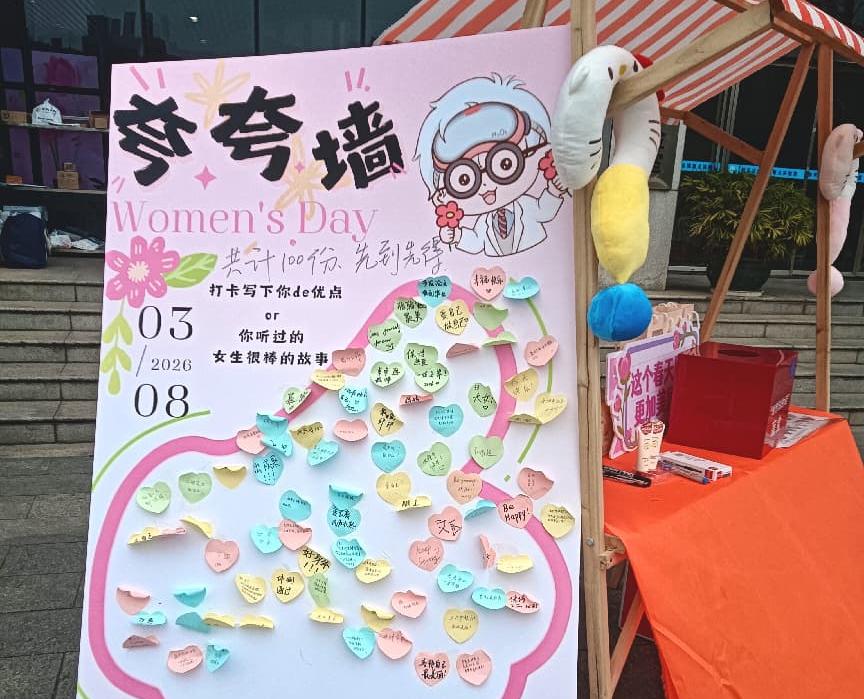 现场设立的“夸夸”墙互动区反响热烈,吸引了众多师生踊跃参与,他们通过便签分享个人成长感悟,讲述身边优秀女性的奋斗故事。文字间传递的不仅是赞美,更是女性群体间相互扶持、自信自强的精神共鸣。活动还设置了惊喜好礼抽奖环节,参与互动即可赢得精美礼品,进一步提升节日幸福感。