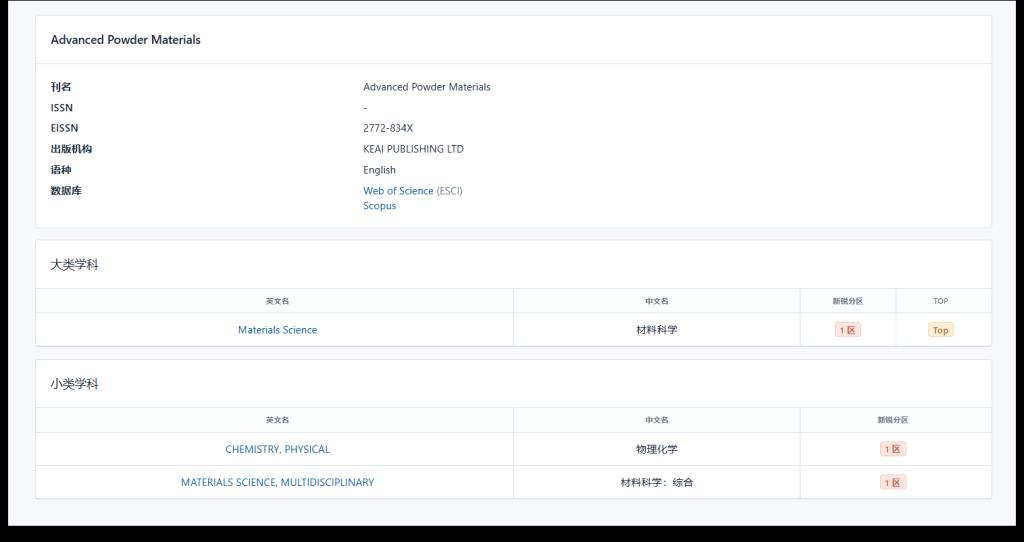 3月24日,由新锐学术研制的《新锐期刊分区表》(简称“新锐分区”)正式发布。我校主办的期刊《先进粉体材料(英文)》,英文刊名Advanced Powder Materials(APM),入选大类学科材料科学1区Top;小类学科物理化学1区,材料科学(综合)1区。这标志着《先进粉体材料(英文)》的办刊质量、影响力和业内认可度已达到国际顶刊水平。